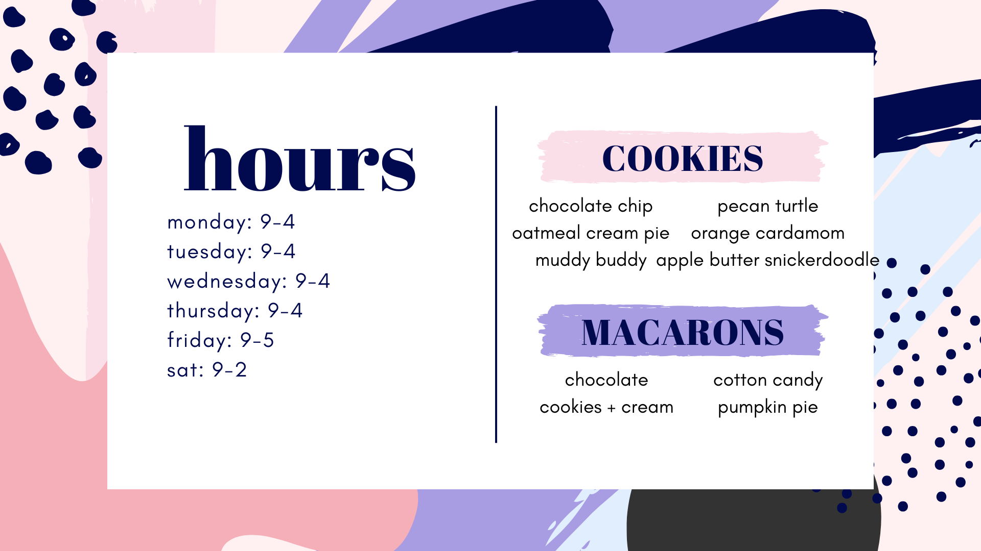 Welcome to the online home to Millie’s Mama Bakes, a gourmet cookie shop in the heart of downtown Sanford, NC (233 Wicker Street). We offer a rotating weekly schedule of our beloved ¼ pound gourmet cookies, french macarons, cupcakes, cinnamon rolls, soft baked pretzels and cookie cakes! You can also catch us out and about in our Cookie Trailer or teaching cookie classes! Take a look at this weeks in store menu below!